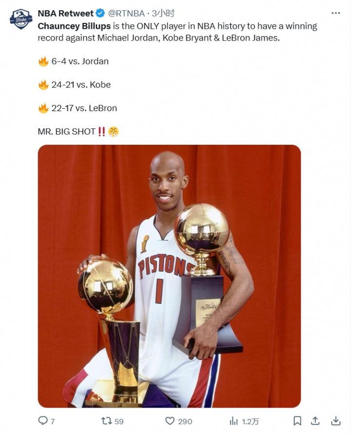 01月 15 2026 0 历史唯一对詹姆斯科比乔丹生涯战绩都占上风?这是谁的部将! xiaoqiao 2026-01-15 英超 169 美账号NBA Retweet晒出一组数据:昌西-比卢普斯是NBA历史唯一一名,职业生涯对乔丹、科比、詹姆斯交手战绩都占上风的球员!VS乔丹 6胜4负VS科比 24胜21负VS詹姆斯 22胜17负